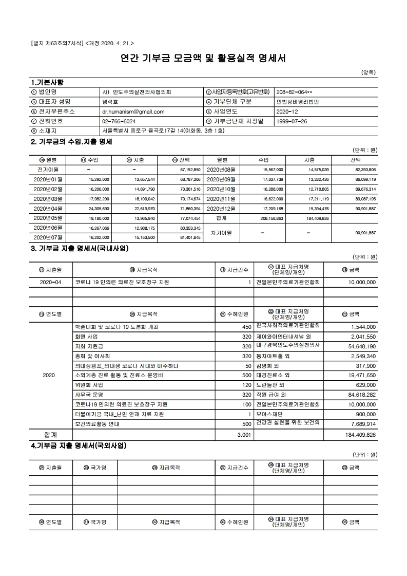 2020년 인의협 기부금 모금(회비 등) 및 활용내역 공개합니다.